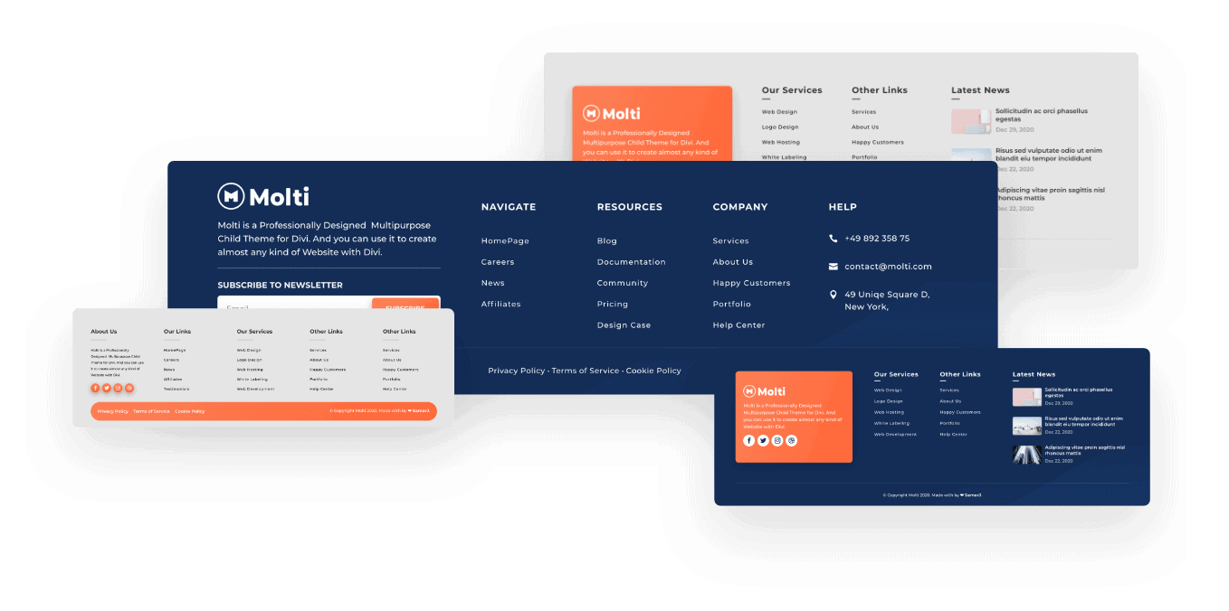 With Molti Child Theme you don’t only get many amazing Designs and Functionalities It also provides you 6 Awesome Footer Designs that fit any kind of website.